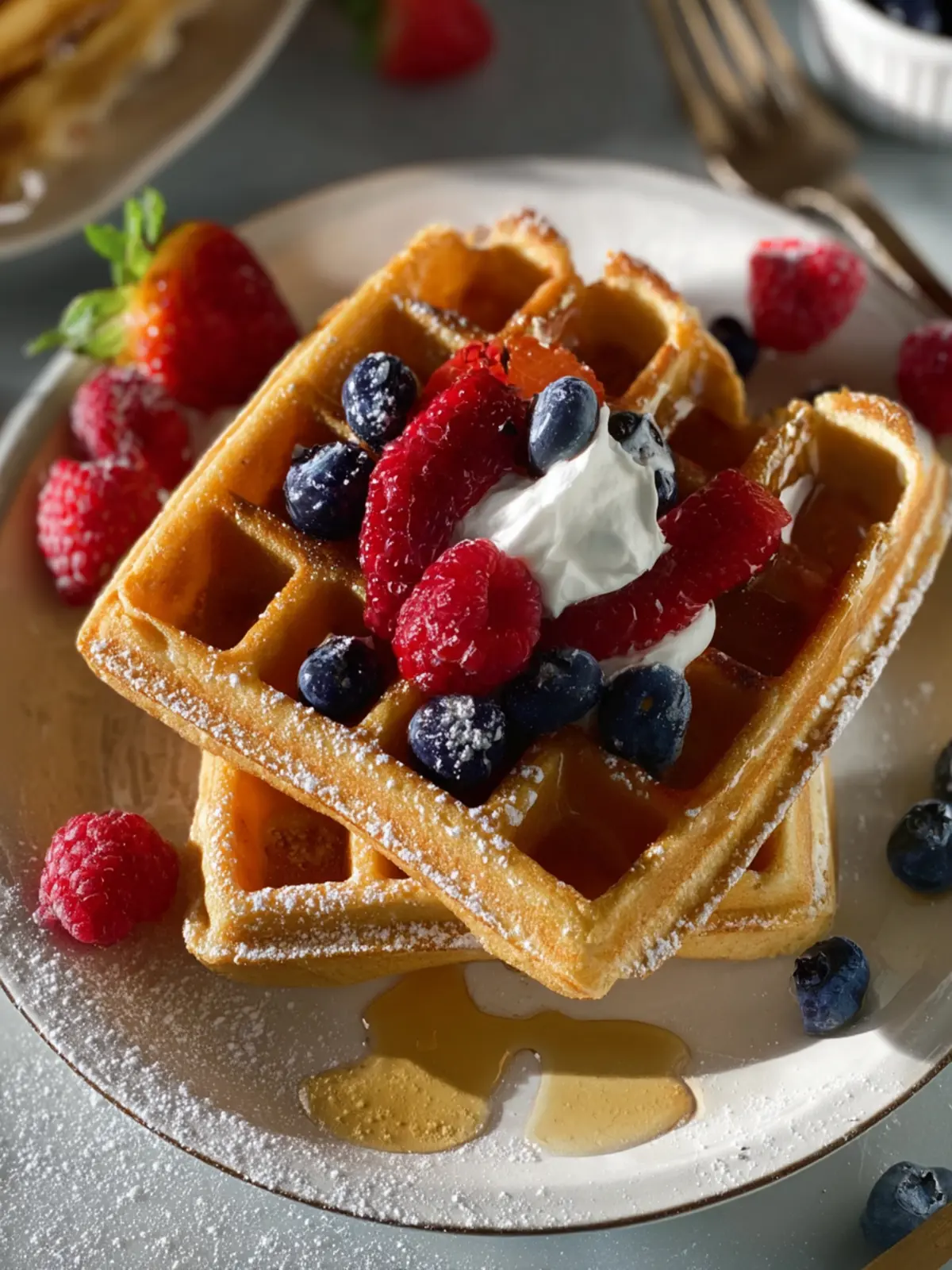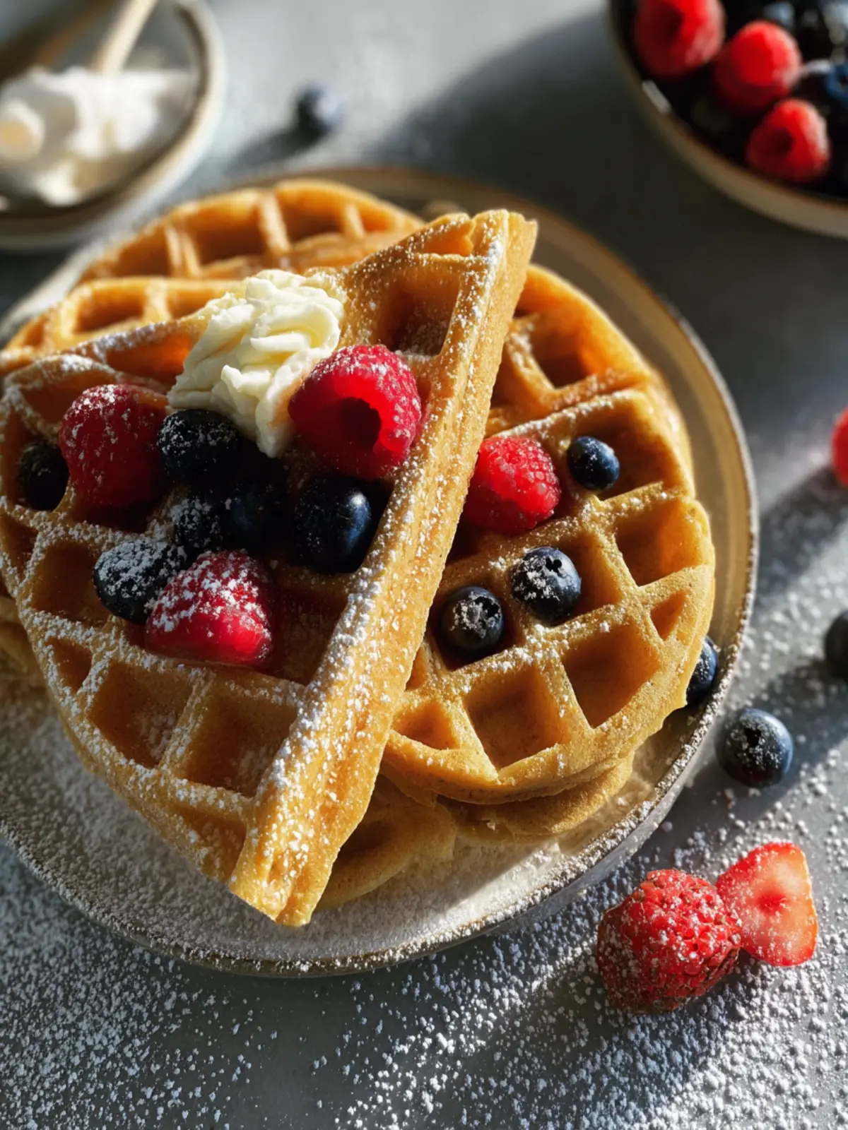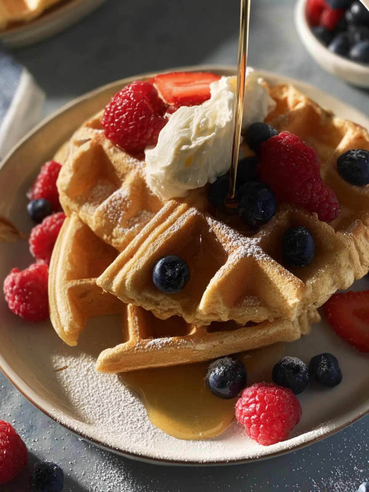 Fresh Berries: Strawberries, blueberries, and raspberries not only add a pop of color but also provide natural sweetness and antioxidants. Toss them on top for a refreshing contrast to the waffle’s nutty flavor.