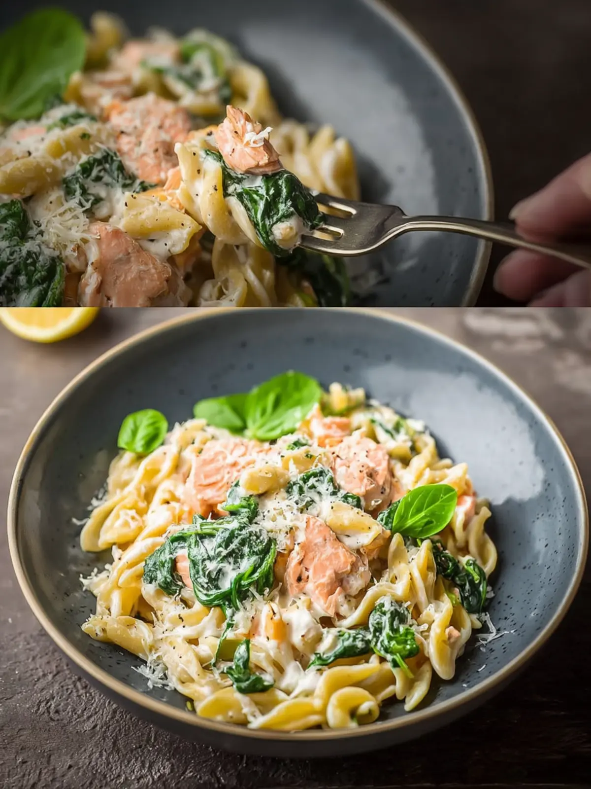 A deliciously creamy pasta dish featuring salmon and spinach, perfect for a quick dinner!