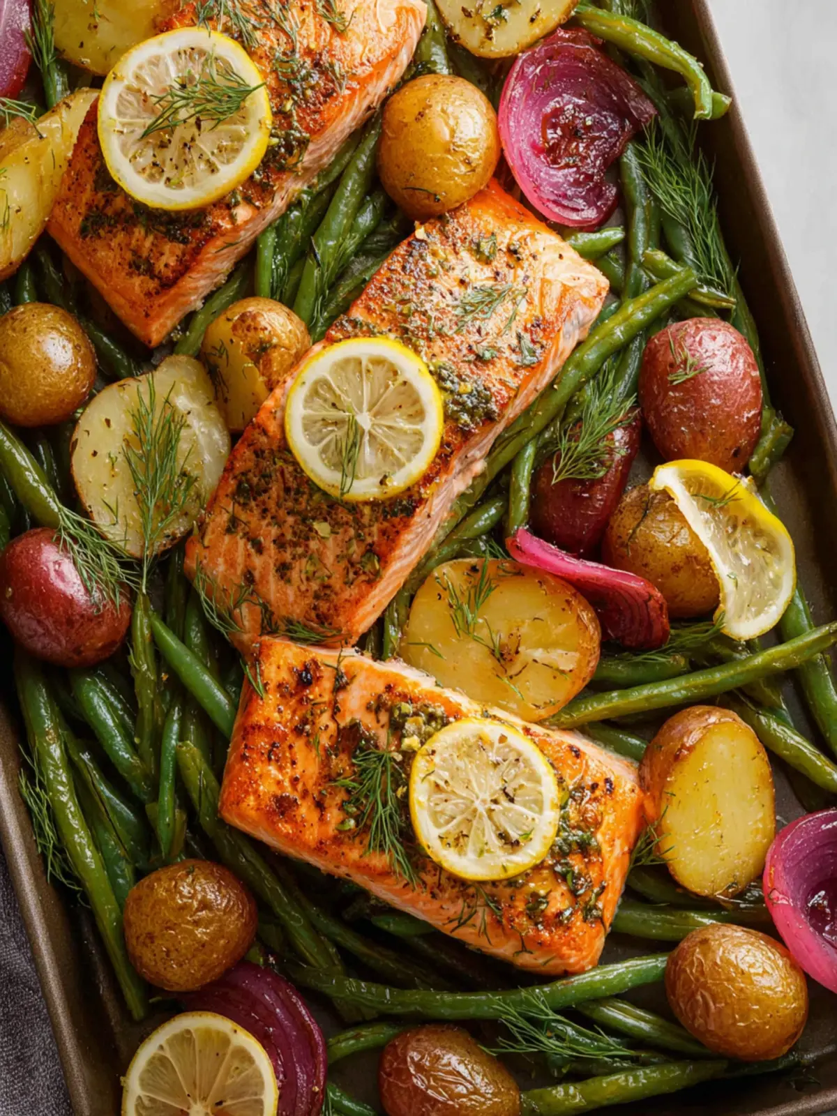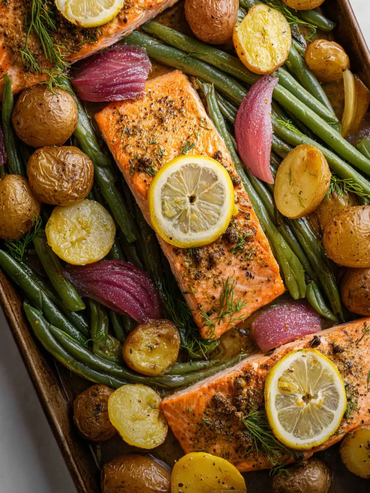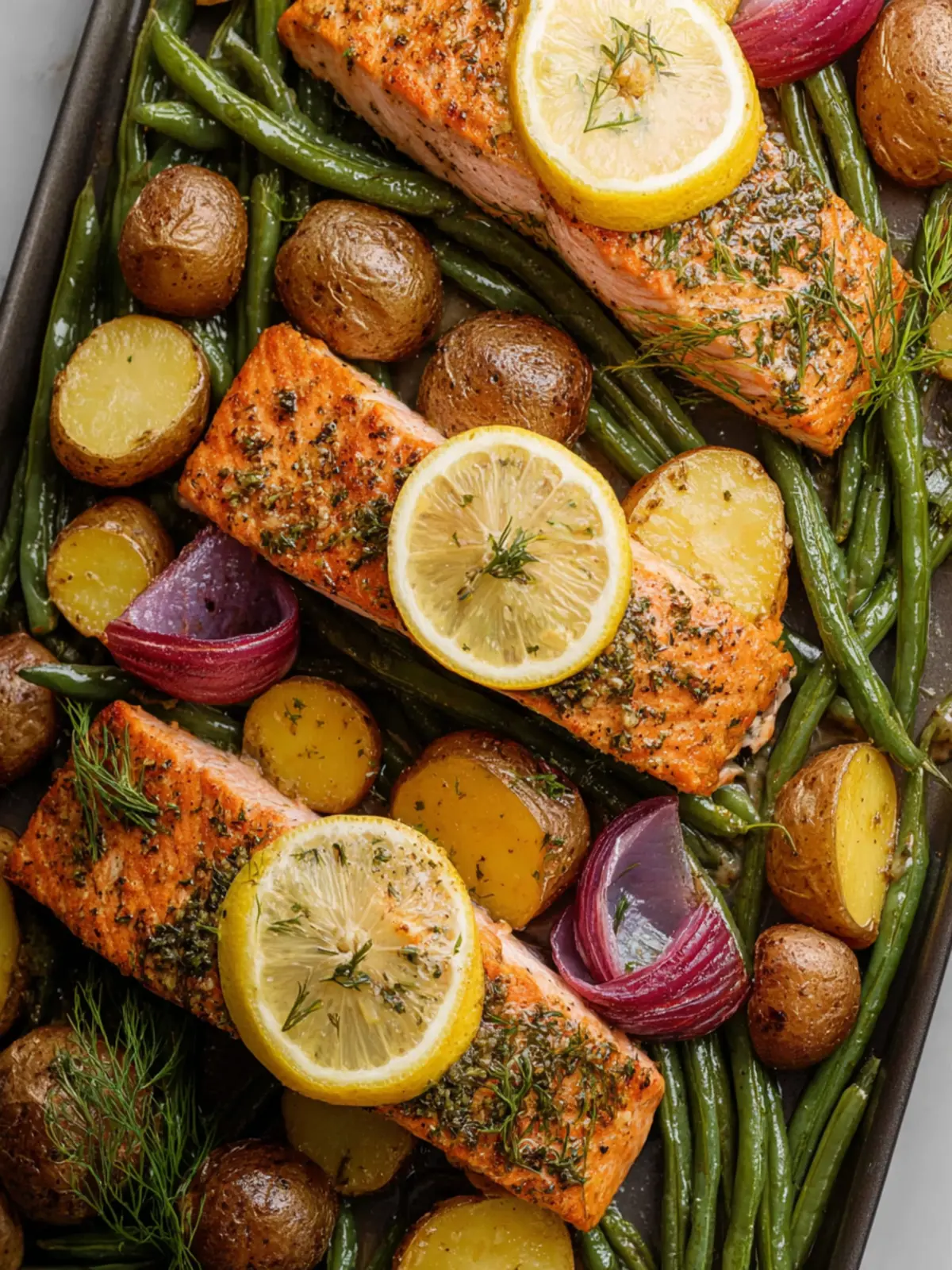 A delicious and healthy sheet pan salmon recipe with roasted potatoes, green beans, and purple onions, perfect for a quick weeknight dinner.