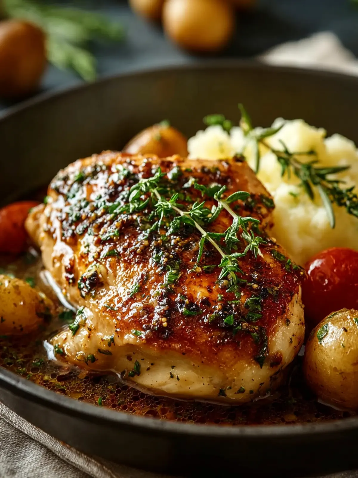 A delicious garlic herb chicken served with creamy mashed potatoes.