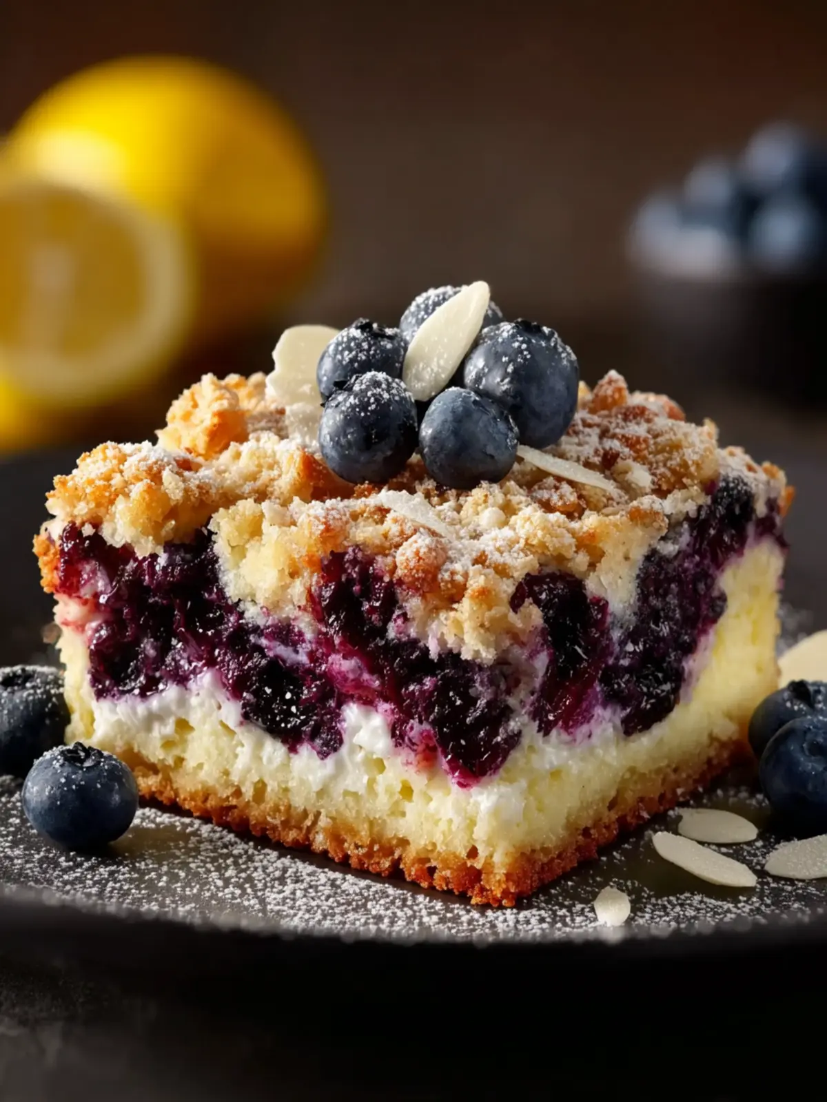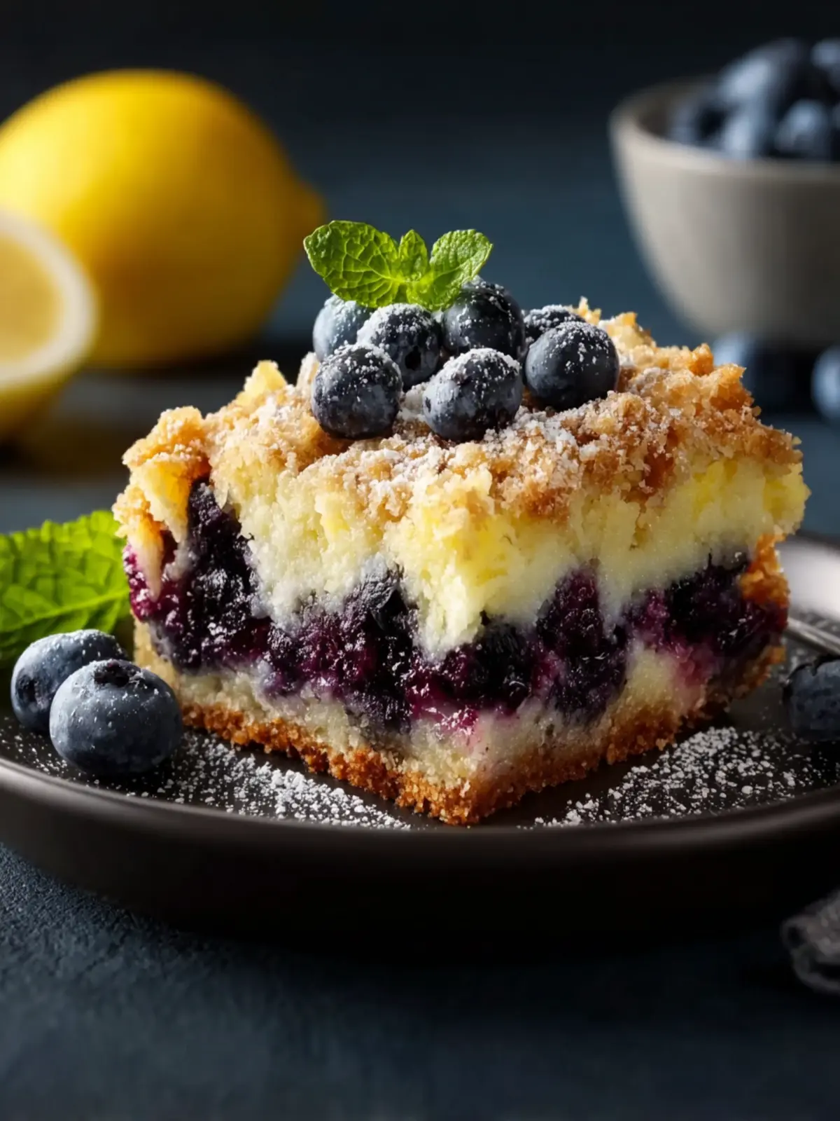 Imagine walking into a gathering with this eye-catching dessert, the vibrant colors striking against a backdrop of sunny yellows and deep blues. It stirs excitement and anticipation. What’s more, the heavenly aroma of baked lemon and blueberries wafting through the room invites everyone to indulge. The texture is something to rave about, featuring a perfect balance of moist cake, smooth cheesecake, and fruity toppings. Truly, it’s a dessert that leaves a memorable impression at every gathering.
