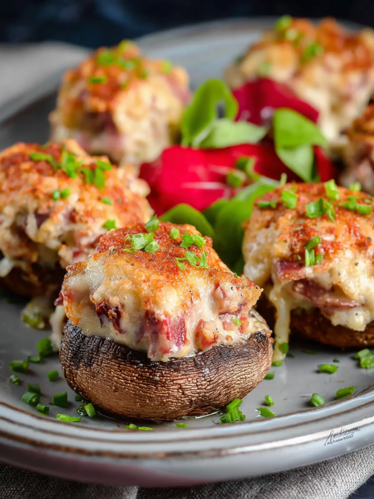 Delicious stuffed mushrooms filled with a classic Reuben mixture.