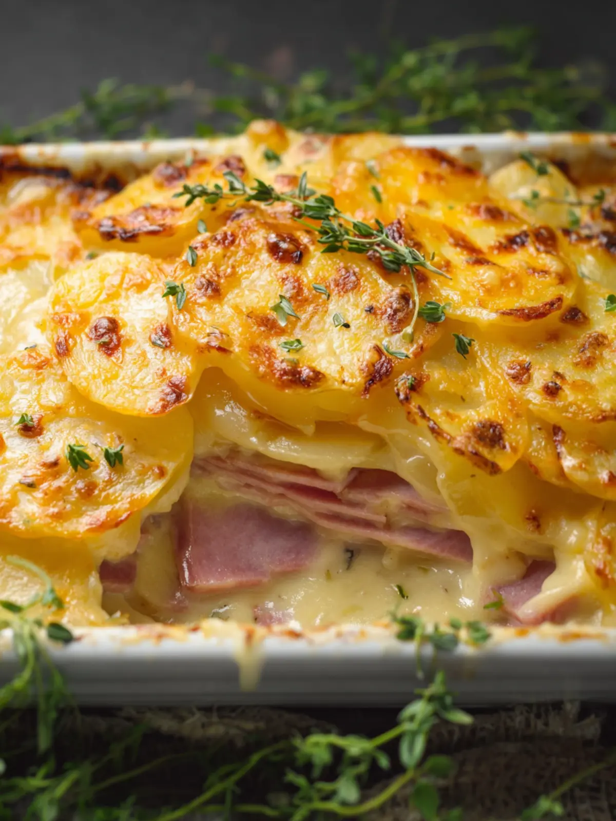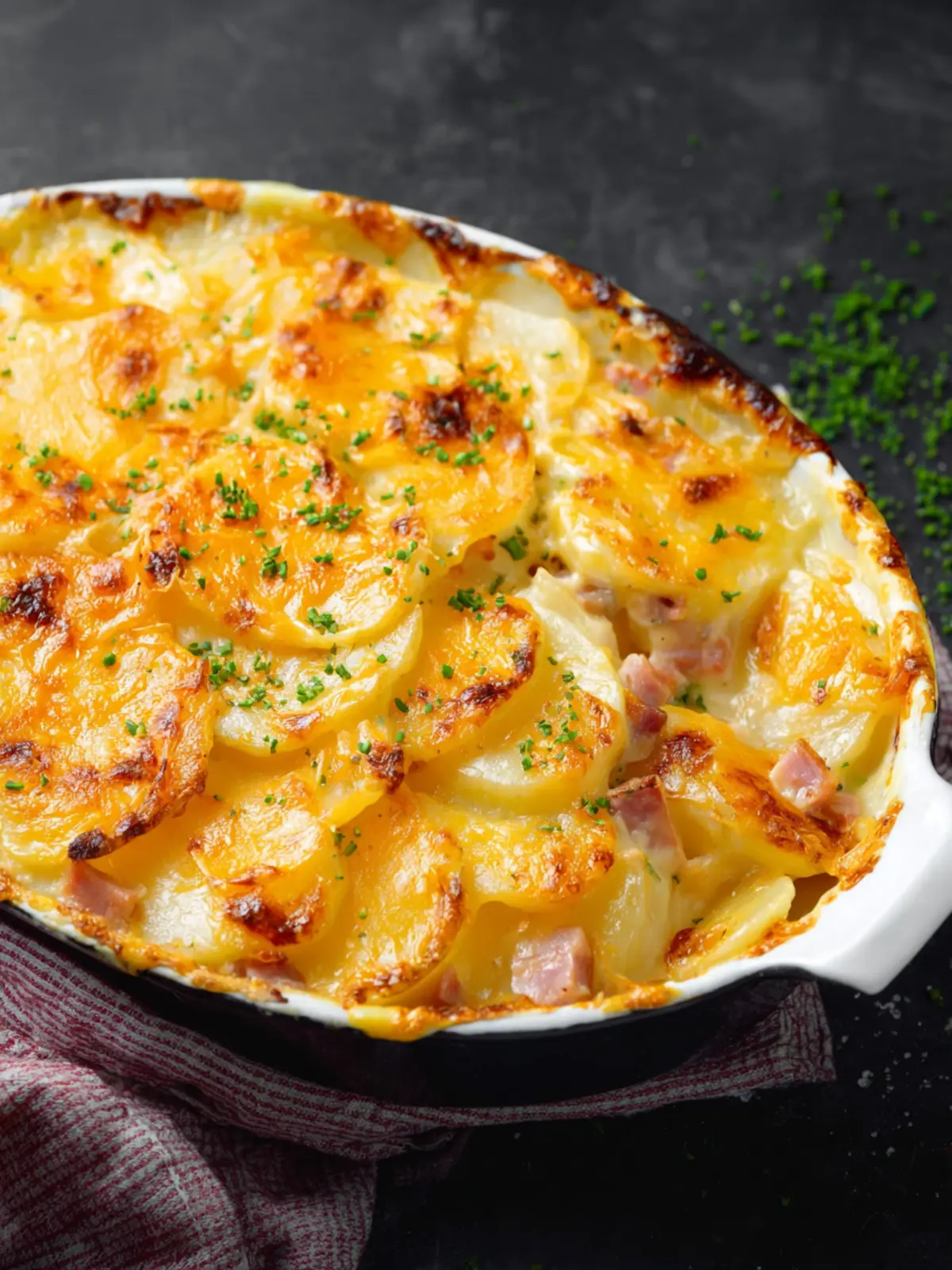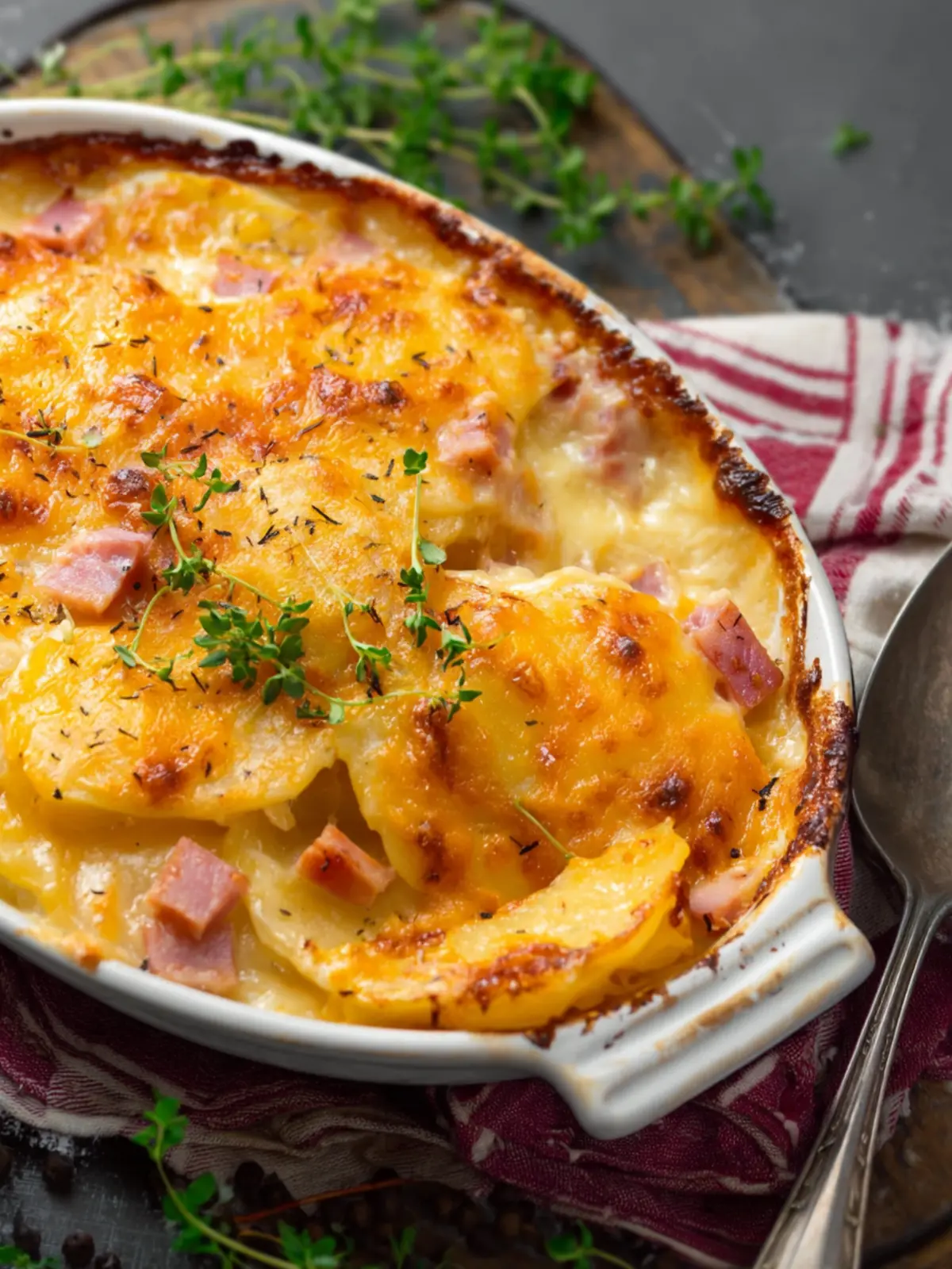 A delicious cheesy ham and potato casserole perfect for a family meal.